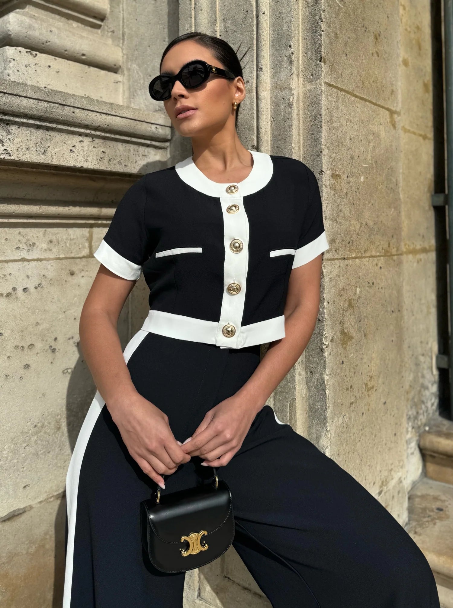 Elevate your wardrobe with this sophisticated two-piece set, featuring a cropped blouse and tailored pantaloon pants crafted from luxurious Patou crepe. The cropped blouse adds a modern and refined flair, while the flowing pantaloon pants ensure comfort and effortless elegance. Perfect for versatile styling, this set seamlessly blends chic style with practicality, offering a contemporary and polished look.